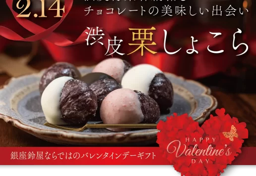 銀座鈴屋では、毎年ご好評をいただいている、和の趣を大切にした、和モダンスイーツのバレンタインギフトをご用意いたしました。 当店がお勧めするバレンタインギフト向け商品「渋皮栗しょこら」。 渋皮付栗甘納糖にチョコレートをコ...